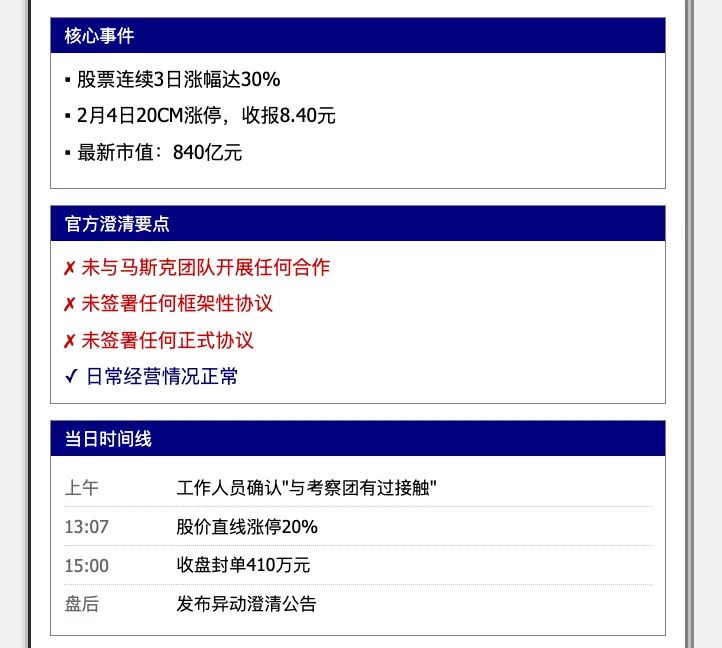 公告核心内容:经核实,公司未与马斯克团队开展任何合作,亦未签署任何框架性协议或正式协议。