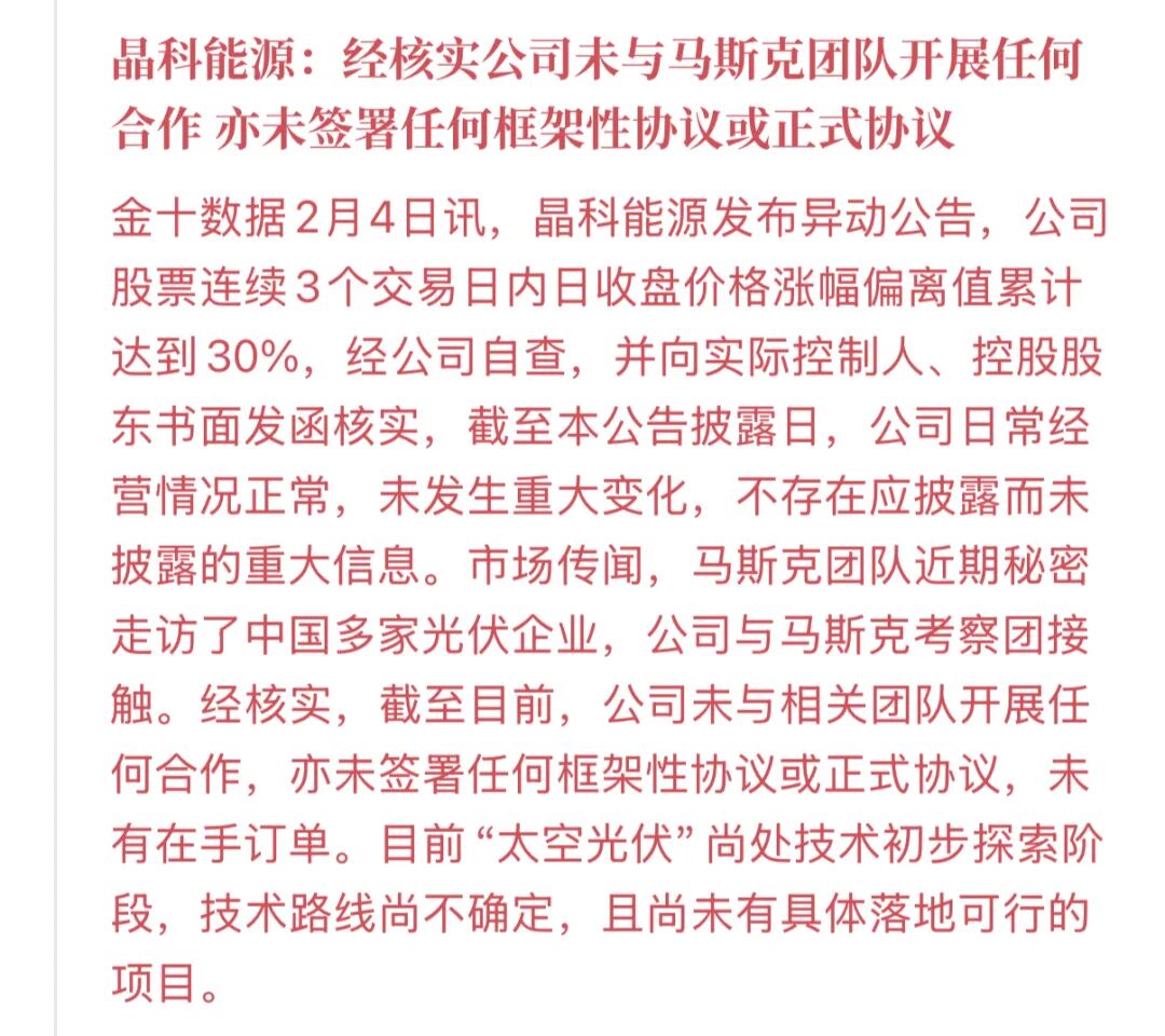 2月4日晚间,晶科能源发布股票交易异动公告。公司股票连续三个交易日收盘涨幅偏离值累计达30%,触发信披要求。