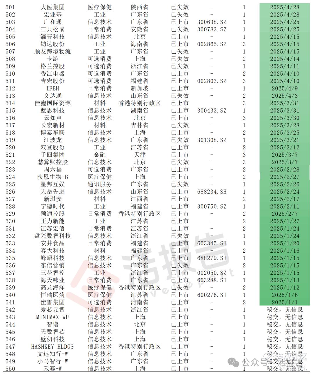 表:2025年至2026年1月递表公司所属行业情况:
