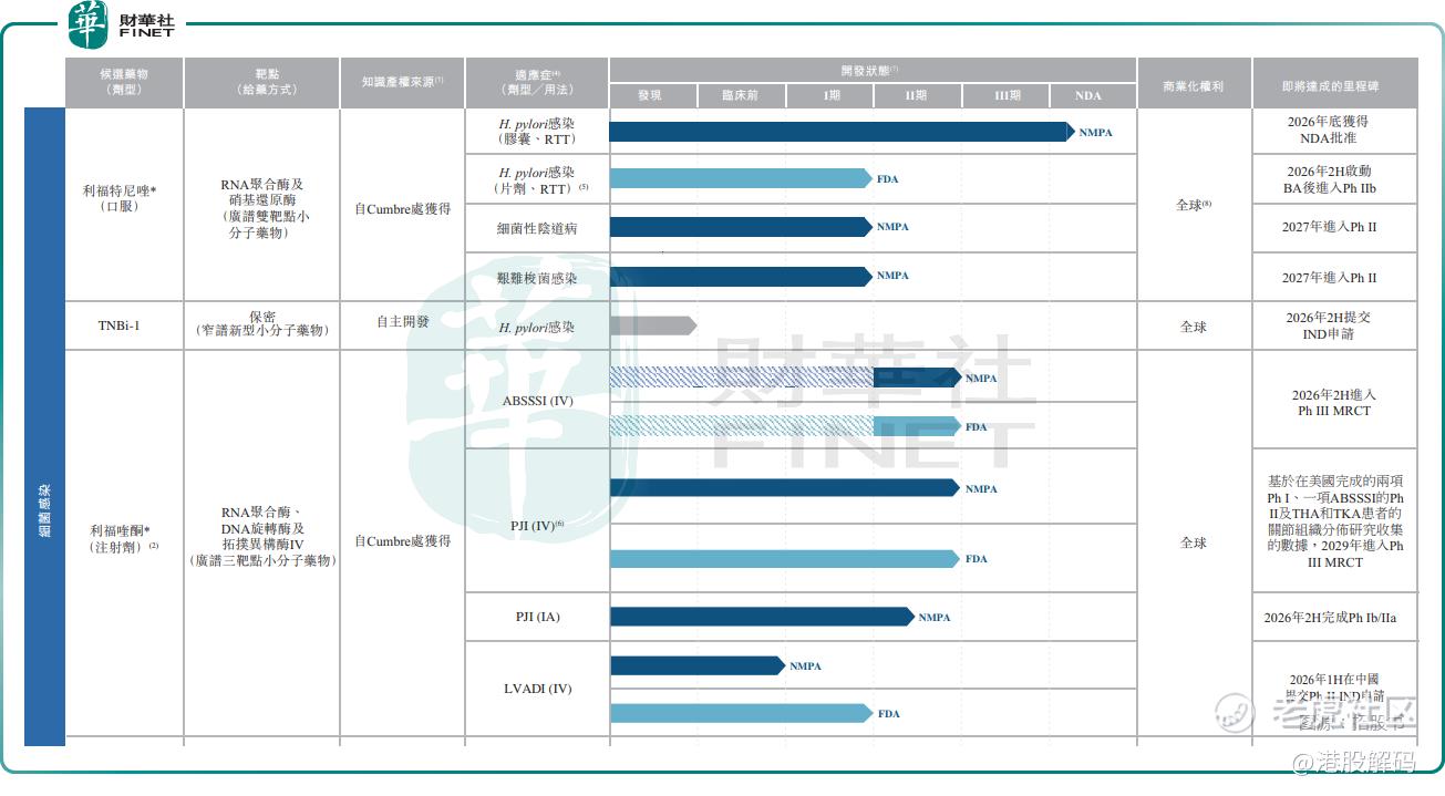 另一款核心产品利福喹酮(TNP-2092注射剂)则是一款三靶点治疗植入体相关细菌感染。截至今年1月24日,利福喹酮注射剂已获得国家药品监督管理局和FDA的新药临床试验(IND)许可,用于治疗人工关节感染(“PJI”)和急性细菌性皮肤和皮肤结构感染(“ABSSSI”)。