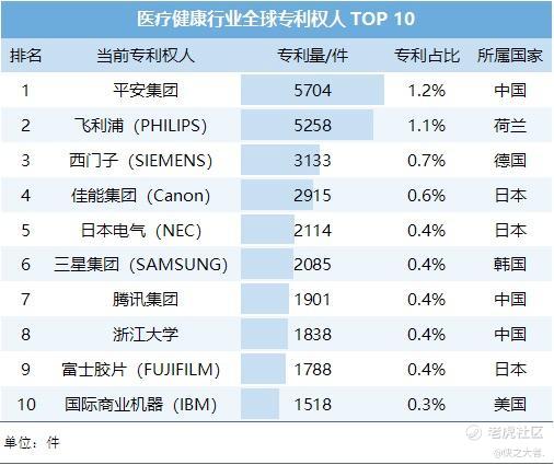 医疗健康行业全球专利权人TOP 10
