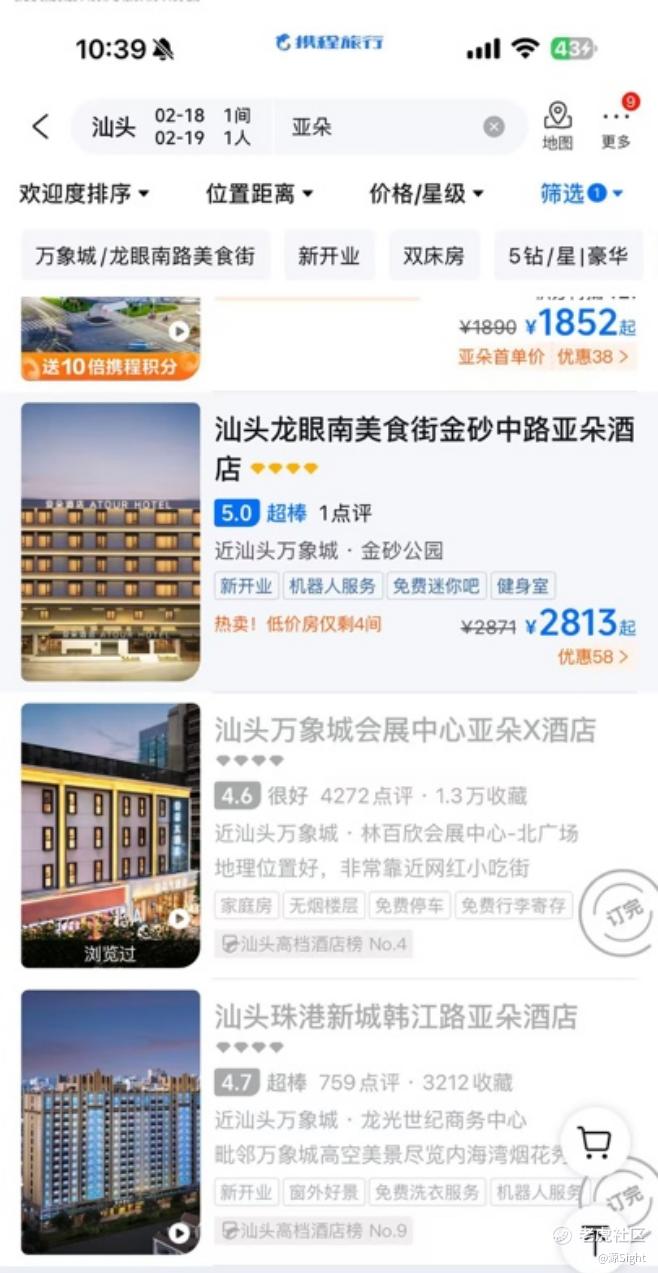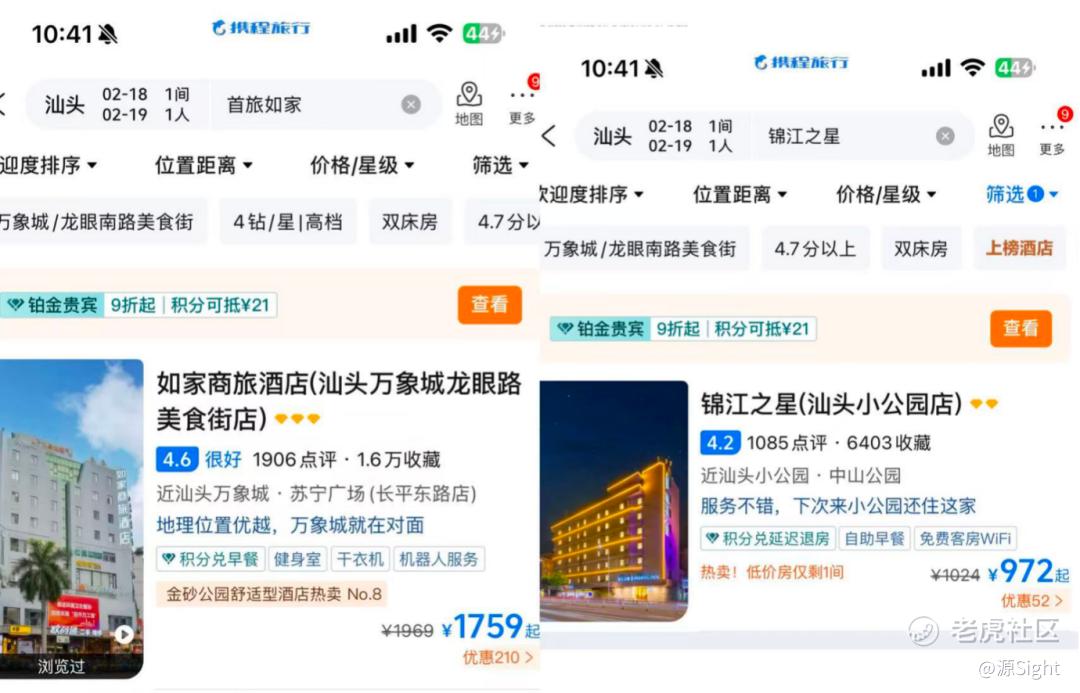 事实上,这期间涨价的酒店品牌不止亚朵一家。在同样的入住时间里,汕头如家、锦江酒店的房价也均有不同程度的上调,部分房型也超过1000元一晚。如家、锦江之星等品牌酒店也出现或是满客,或是较大幅度上调房价的情况。