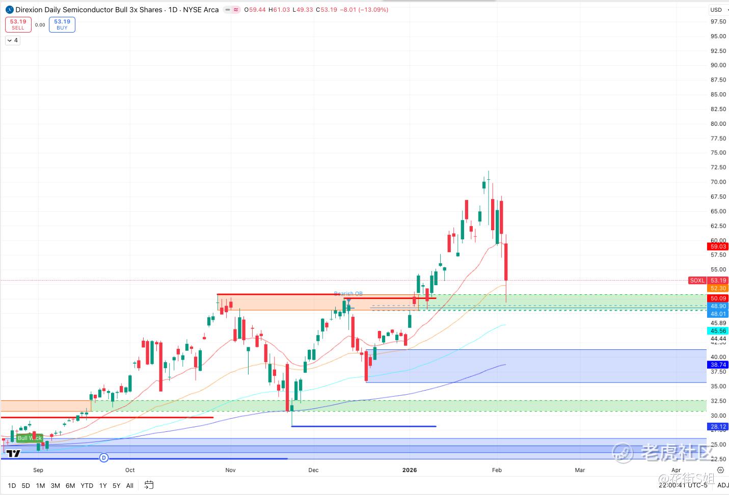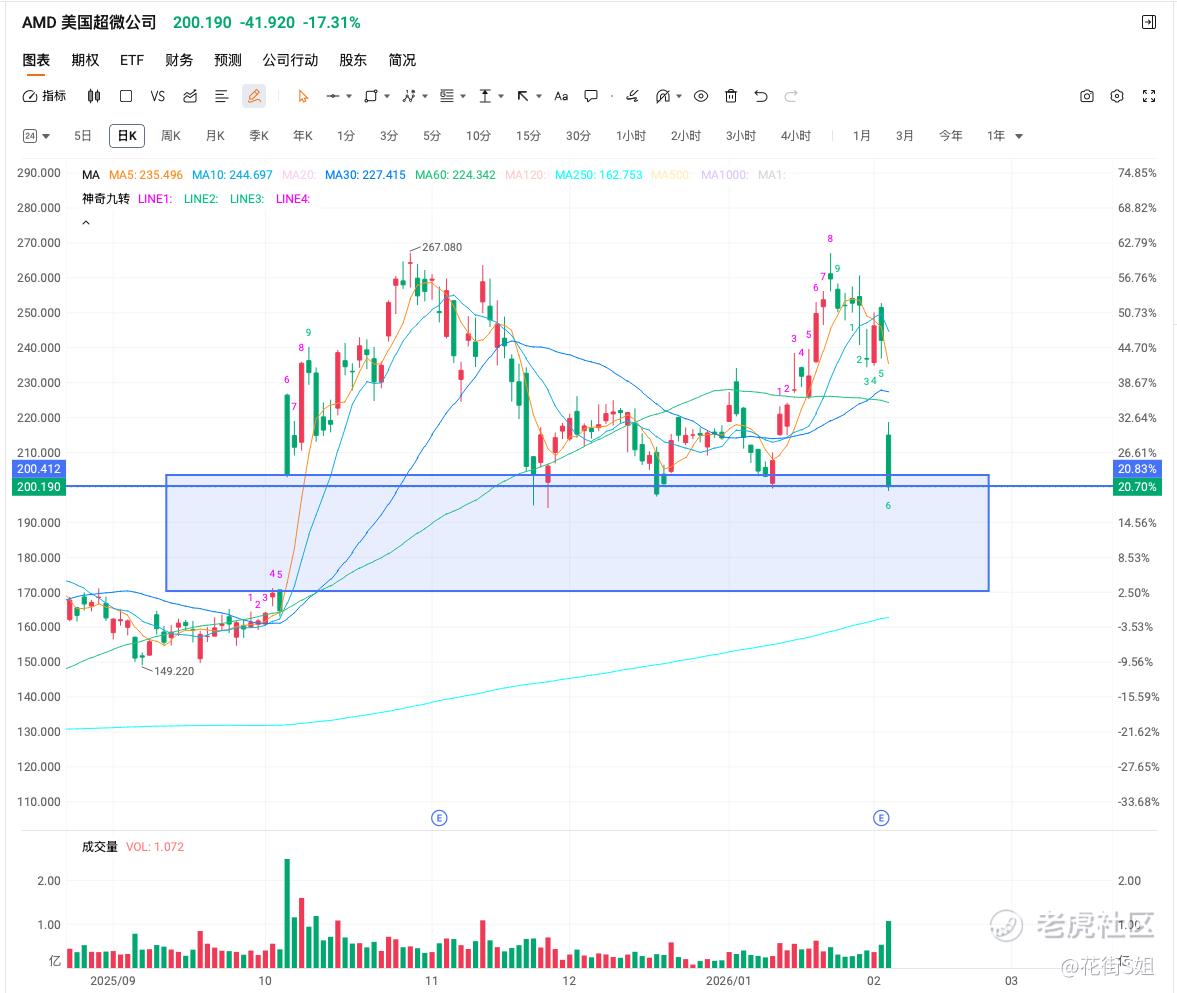 费城半导体指数相比之下,形态还好,下探到50左右的位置反弹,相比软件好太多了。昨天这波下跌主要是AMD的财报带崩了,昨天从amd开盘的情况来判断,很明显短期内的目标价在 200左右的位置,会不会继续去补 170的位置,当前不好说。不过amd的指引一向比较保守,再加上 cpu的叙事,如果真的能有 170的位置我觉得是不错的。