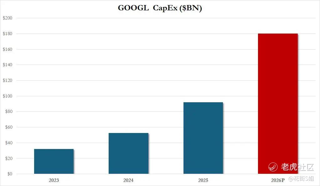 Alphabet在财报中宣布,2026年全年资本支出预计在1750-1850亿美元之间,相比2025年的914亿美元,几乎翻倍。这一数字远超市场预期,也是GOOG盘后股价一度暴跌6%的直接原因。投资者既期待AI带来的增长红利,又担心过度投资侵蚀利润。