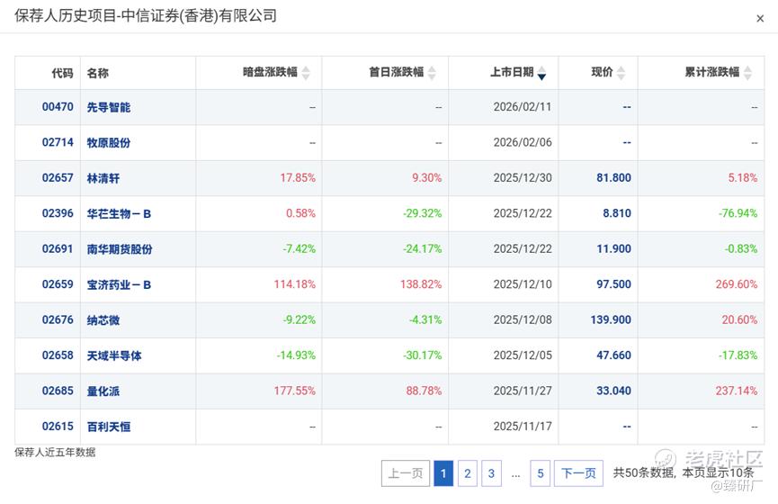 中信证券历史上作为保荐人参与了47个项目,其中暗盘和首日都有38家公司上涨,8家公司下跌,1家公司平盘,破发率17.02%,胜率较高。今年以来参与的32个项目中,仅有8个项目首日或暗盘破发,其中有13家公司录得50%+的累计涨幅,仅5家公司录得25%+的累计跌幅。说明中信保荐的项目综合素质都很不错,自身也拥有优秀的护盘能力,整体保荐胜率很高。
