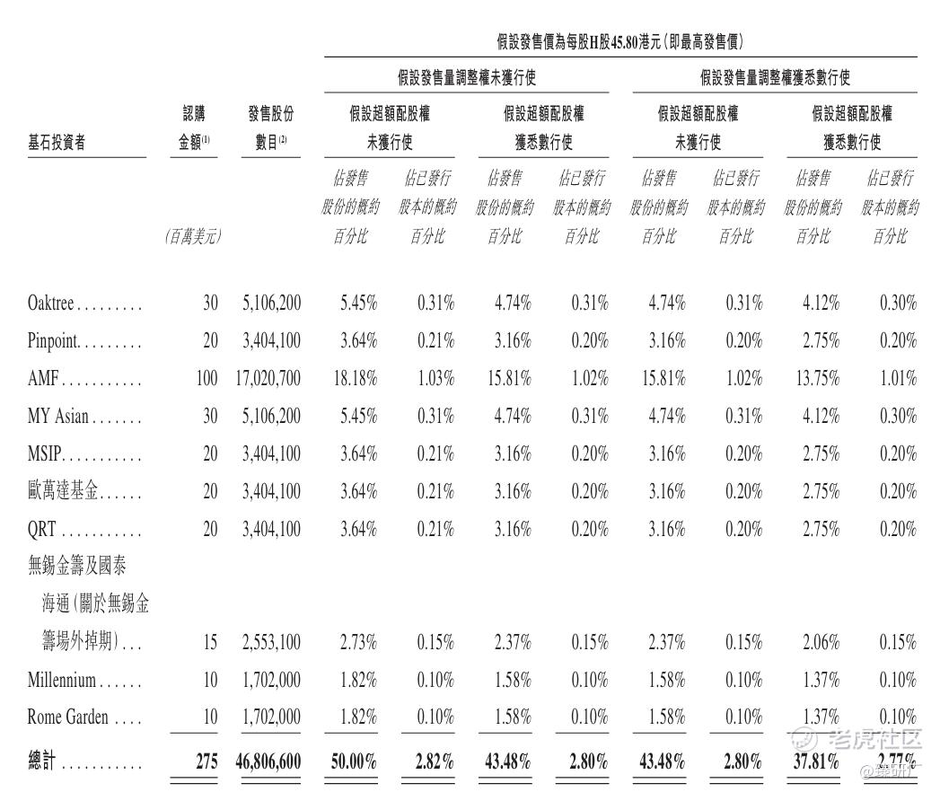 共10名基石投资者:橡树资本、保银资管、Aspex、欧万达基金、千禧年基金、QRT基金、摩根士丹利、MY Asian、Rome Garden、无锡金筹及国泰海通(关于前者场外掉期),合计认购2.75亿美元,按发售价最高值45.80港元计算,相当于此次全球发售股份的50.00%及紧随全球发售完成后已发行总股份的2.82%(假设发售量调整权及超额配售权未获行使)。