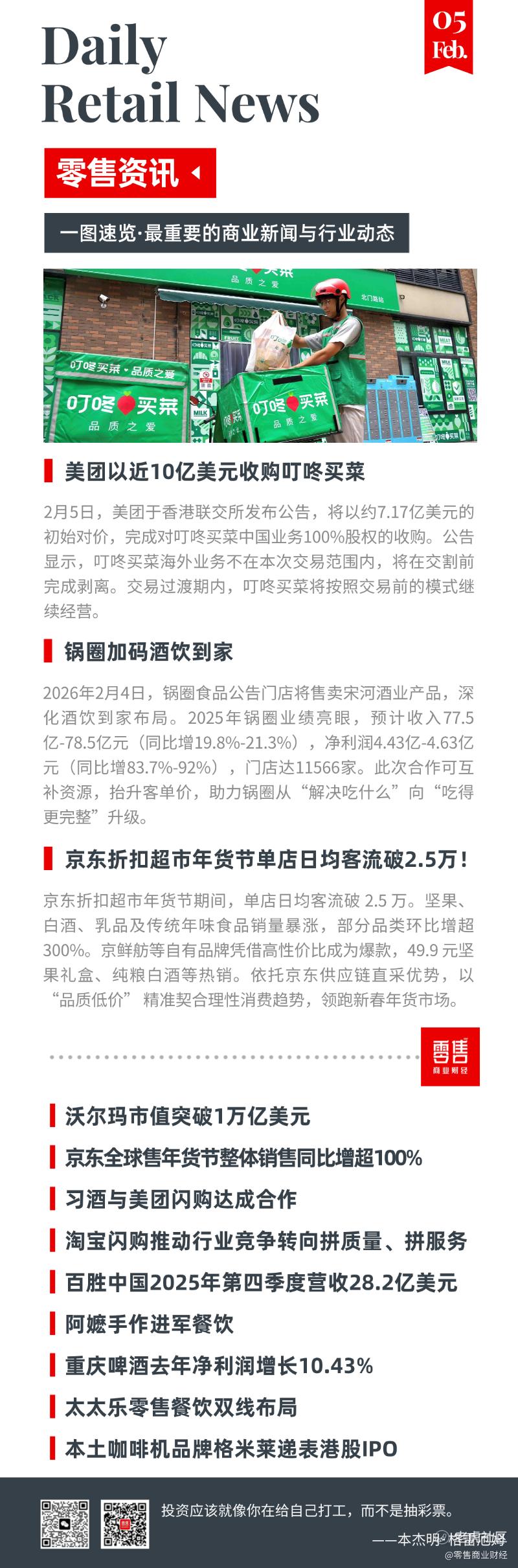美团收购叮咚买菜;锅圈加码酒饮到家;阿嬷手作进军餐饮