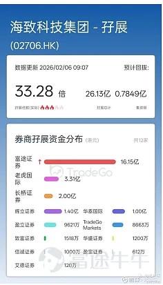 据TradeGo新股孖展数据,截至2月6日9时,海致科技集团的孖展认购总额已达26.13亿港元,孖展认购倍数约33.28倍。其中,富途证券、老虎国际、**证券分别放出16.15亿、3.31亿、2.00亿港元的孖展。
