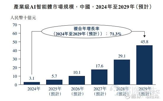 此外,据弗若斯特沙利文报告显示,中国产业级AI智能体市场规模将在2024年到2029年间实现爆发式增长,从2024年 的约人民币31亿元跃升至2029年的人民币458亿元,期间复合年增长率高达71.3%。