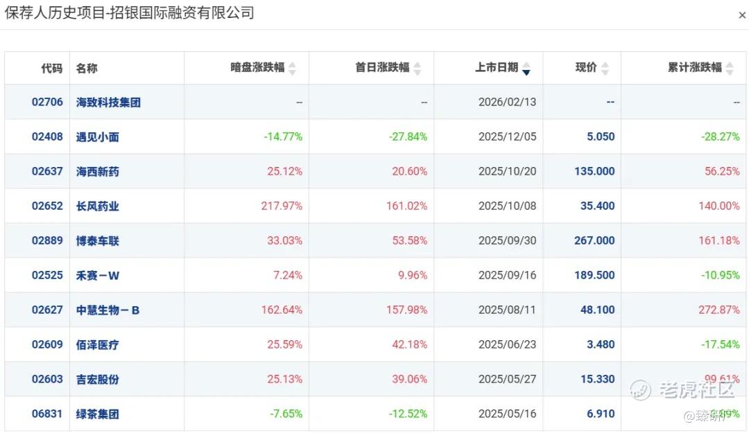 招银历史上作为保荐人参与了55个项目,其中暗盘28家公司上涨,19家公司下跌,8家公司平盘,破发率34.55%;首日34家公司上涨,13家公司下跌,8家公司平盘,破发率23.64%。2025年以来,招银共保荐了13个项目,仅3个项目暗盘和首日下跌,胜率较高。