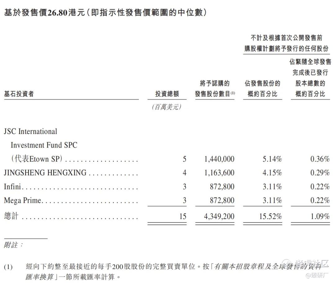 共4名基石投资者:JSC International Investment Fund SPC(北京经济技术开发区财政国资局)、JINGSHENG HENGXING(智谱间接持有)、无极资本、Mega Prime(大湾区共同家园投资旗下平台),合计认购1,500万美元,按发售价中值26.80港元计算,相当于此次全球发售股份的15.52%及紧随全球发售完成后已发行总股份的1.09%。其中,JSC的锁定期为11个月,JINGSHENG HENGXING锁定期为9个月,无极资本和Mega Prime锁定期为6个月。