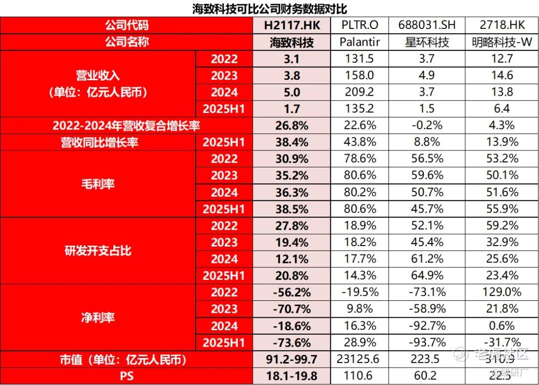 业绩增速方面,Palantir作为全球龙头,虽规模庞大但仍保持中高增速,依托AI技术赋能政务与商业场景,持续释放增长潜力;海致科技凭借新业务爆发实现领跑,虽然2025年上半年增速低于Palantir,但增长动能持续强化。