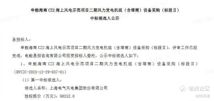 继2月2日成功斩获福建华电长乐55万千瓦海上风电项目,喜迎2026年海风“开门红”后,电气风电(688660.SH)市场攻势再传捷报。近日,申能海南CZ2海上风电示范项目二期风力发电机组(含塔筒)设备采购标段I、II中标结果公示。公示内容显示,电气风电均位列第一中标候选人。两个标段中标总容量为576MW。