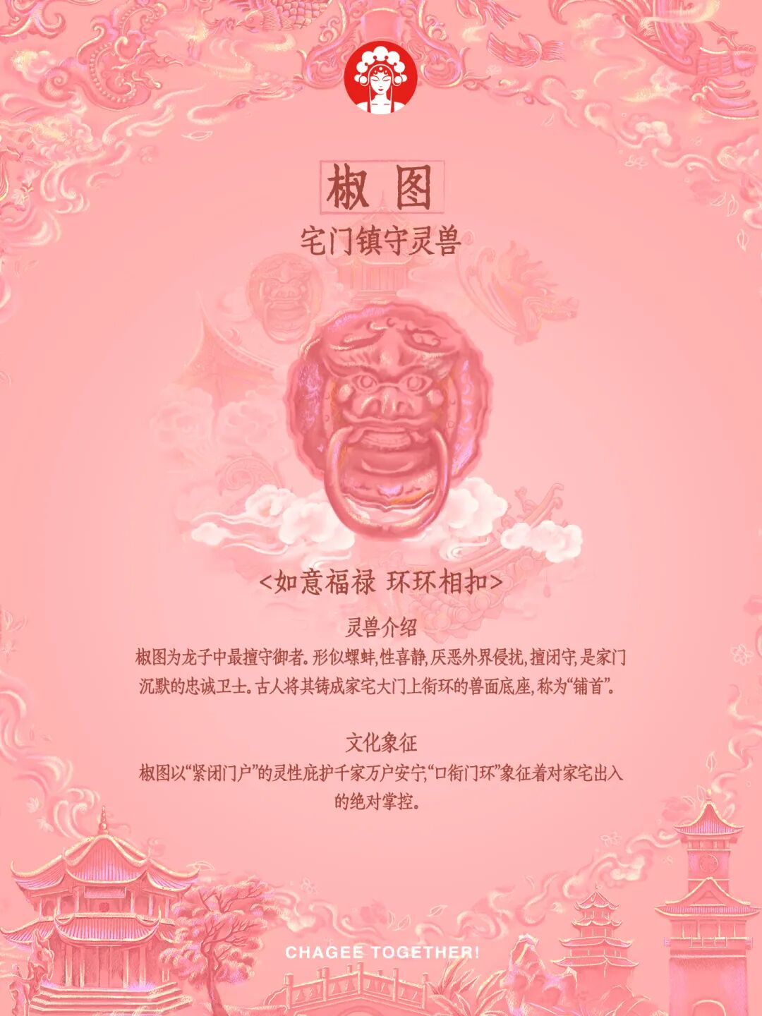 椒图,常出现在门环、门扉之上。它性情内敛,寓意闭门守家。