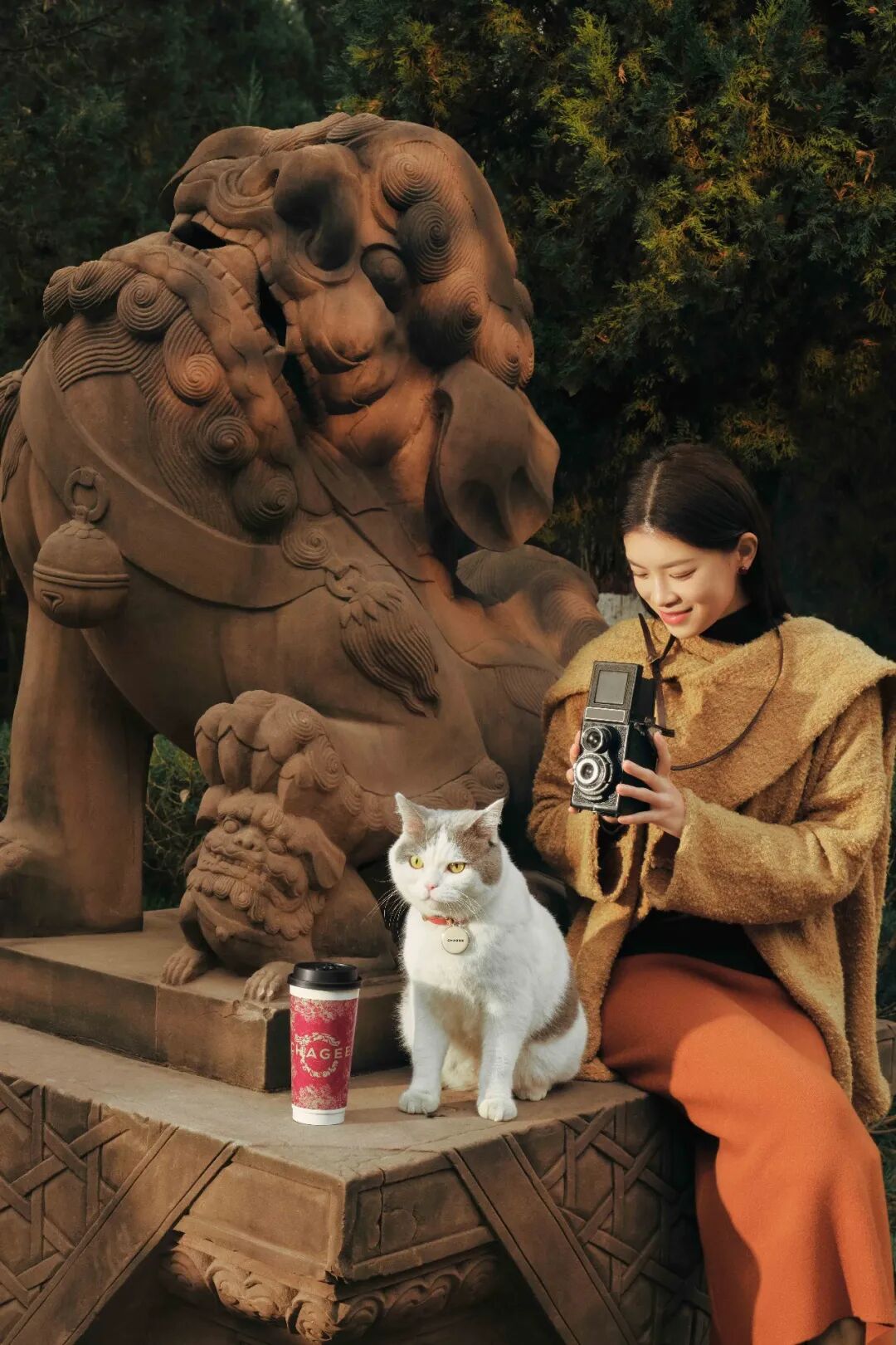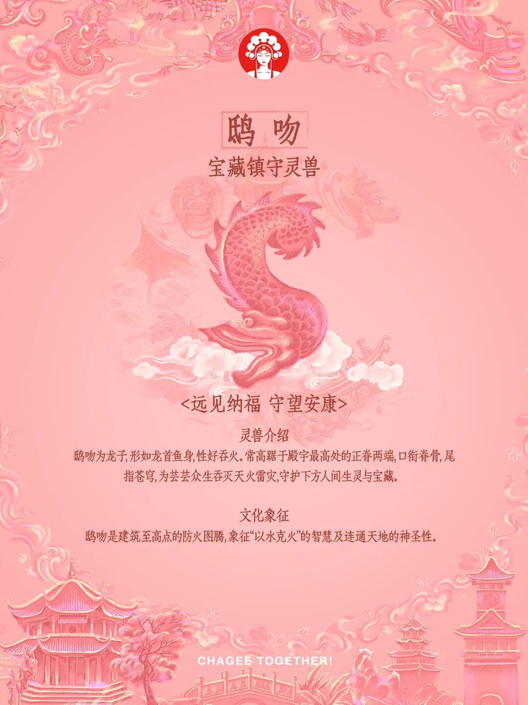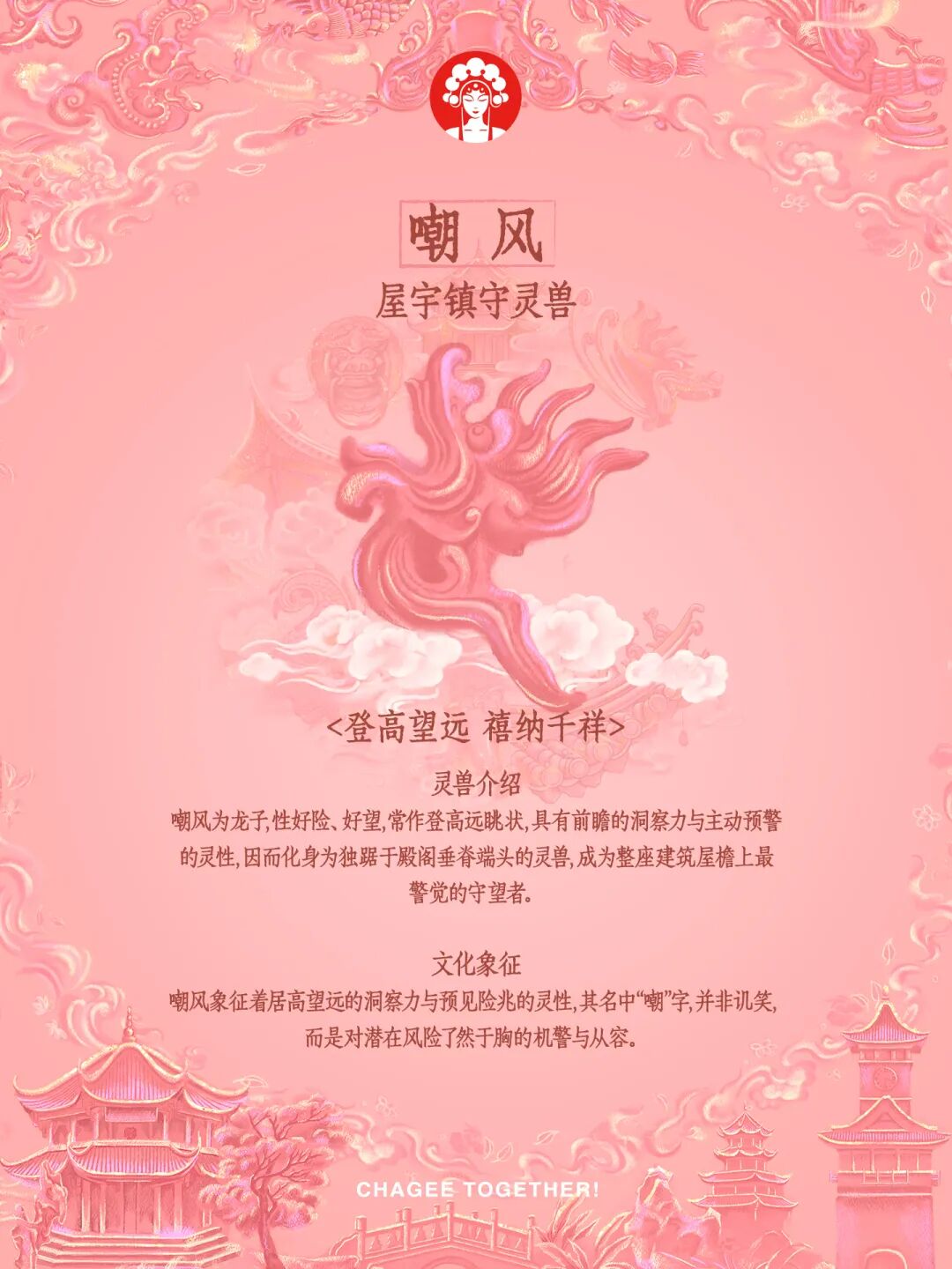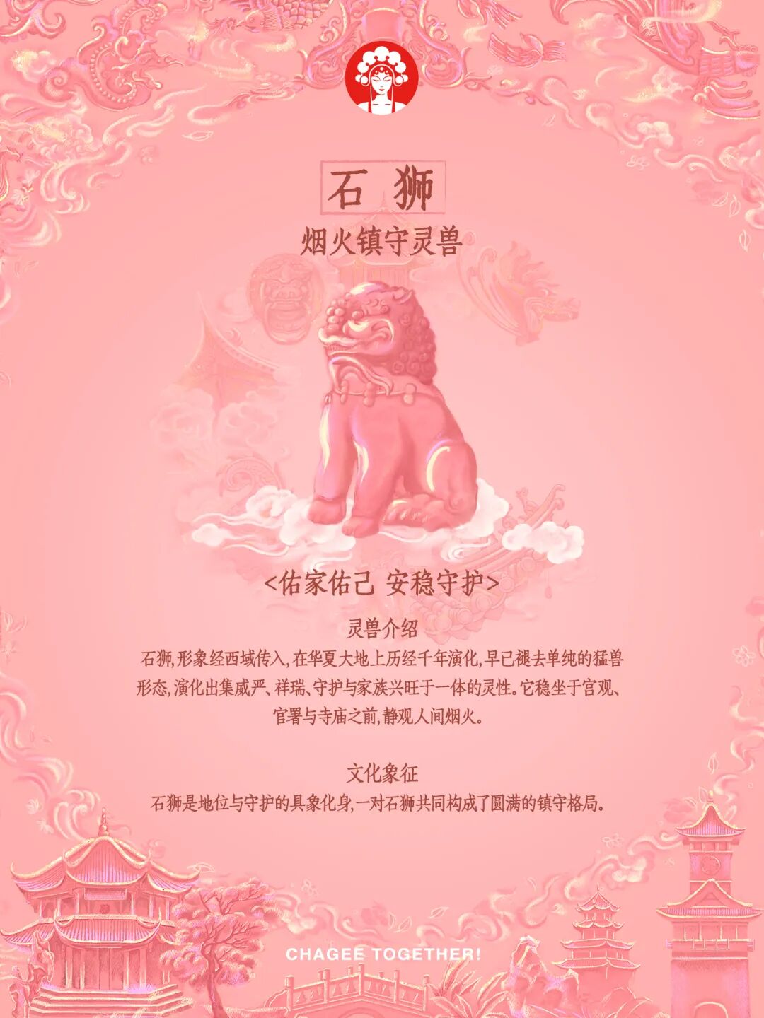 霸王茶姬(四川)于1月23日开启“茶相聚 佑团圆”活动,从成都的古建筑中,选择了四种灵兽意象——门前的石狮,门上的椒图,屋檐上的鸱吻、嘲风。