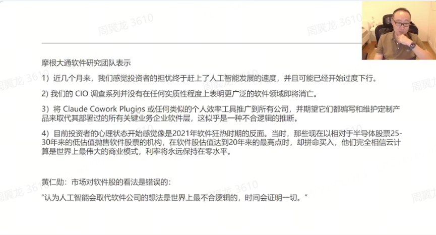 机构看法:摩根大通认为投资者对人工智能的担忧过度,黄仁勋也认为人工智能取代软件公司的想法不合逻辑,时间会证明软件股杀跌是否会纠错。