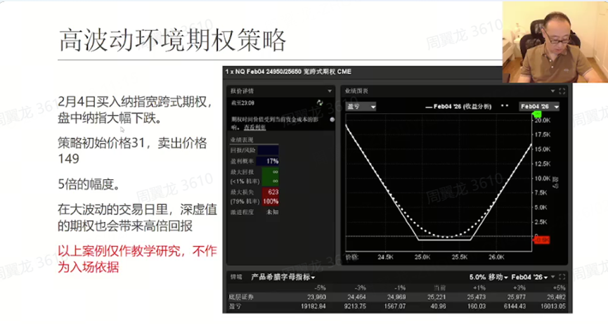 美股这边,老师用一个“实战案例”讲清楚怎么做波动:2 月 4 日他在纳指临界位置,选择“不去赌到底是大涨还是大跌”,而是做“宽跨式期权(双买)”。