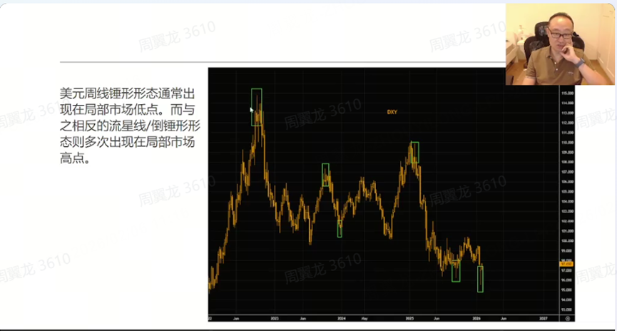 周线结构与走势:美元周线出现锤子线结构,纵观近几年,出现该结构后一般会有回落,当前位置可能成为阶段性低点。