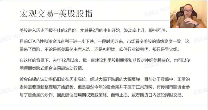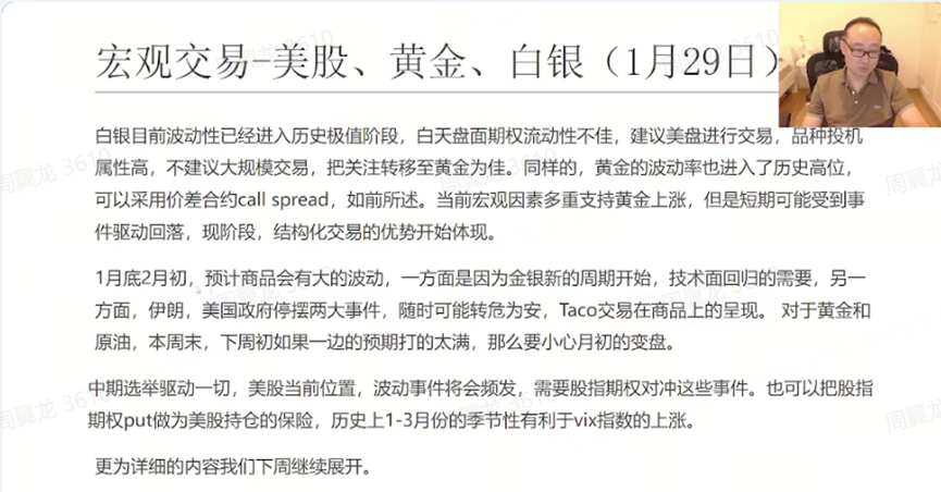 老师一上来先复盘了上周金银的剧烈波动:周四直播后,周五和周一“黄金白银一起发生了历史性的这么一次下跌”,并强调他当时就提醒过“1月底2月初这个商品会有大的波动”。