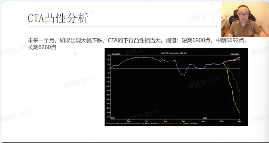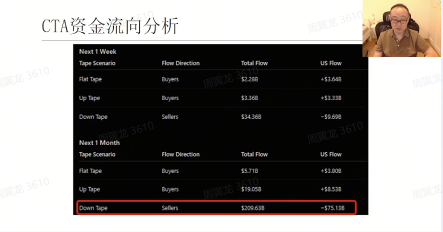 资金行为上,他引用 CTA 资金流向模型:上涨/震荡时流入不大,但在下跌模式下资金流出会显著放大,他说“也是更有利于下跌,下跌是最阻力最小的一个方向”。