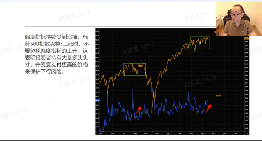 期权维度也在提示风险:他提到“偏度在上升”,意思是“大家在做多美股的同时,同时也买了 put”。