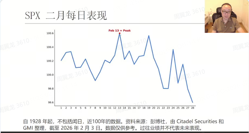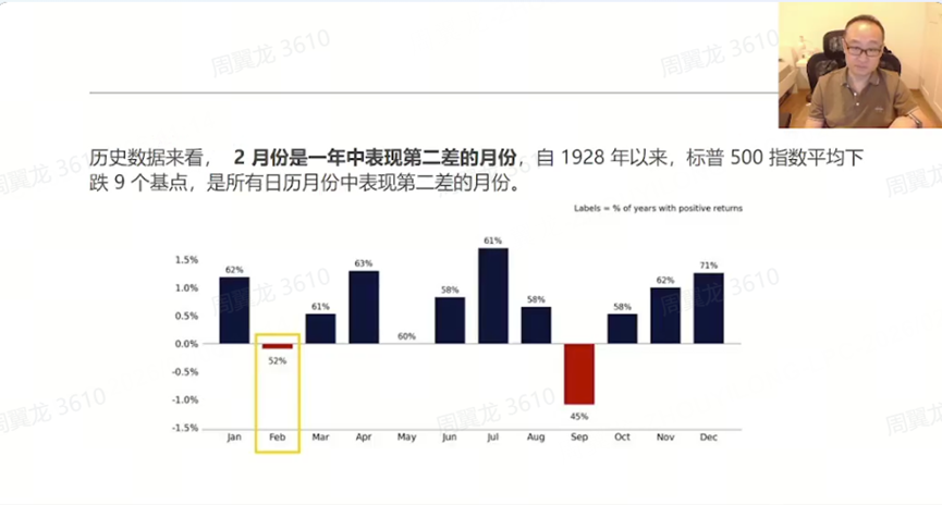 老师直接给了历史统计结论:从 1928 年以来接近 100 年数据看,“两月份是一年中表现第二差的月份”,并且 2 月“下半月开始主要是回落”。