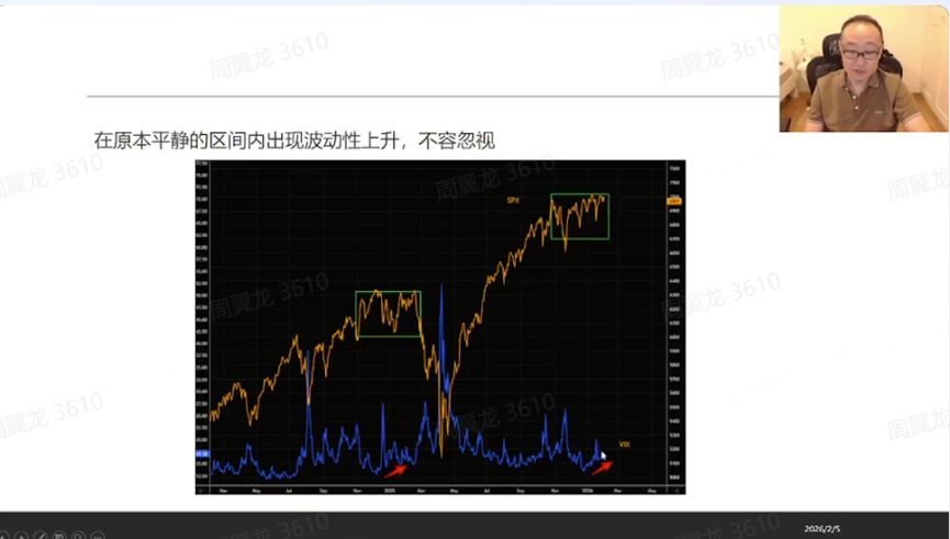 指数层面,老师给了一个很明确的结构观察:标普在“三个多月”的震荡区间里看似平静,但“VIX 的底部在不断抬高”,他认为这“像极了 2025 年初到 4 月份这波大跌之前的这么一个结构”。