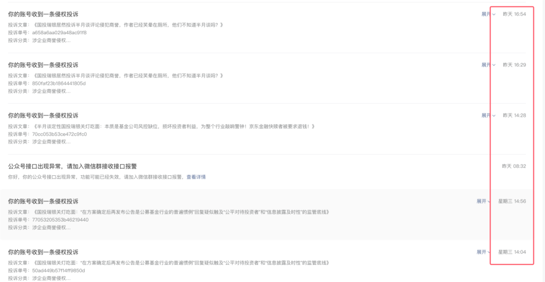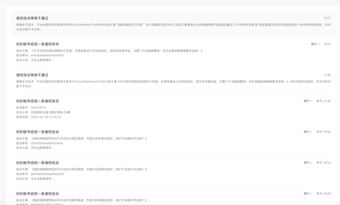 2 、国投瑞银的多次投诉已经被后台驳回,但不知道怎么想的 ,从昨天开始到现在还在继续不断投诉骚扰本尊。有本事你去投诉半月谈啊 ,如此无脑投诉的目的只是发泄一下情绪?这样下去我们受不了,请富强董事长放我一码吧!