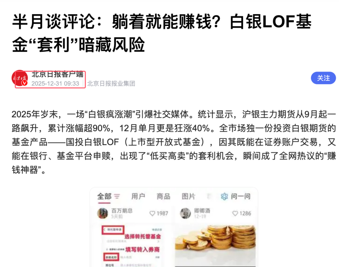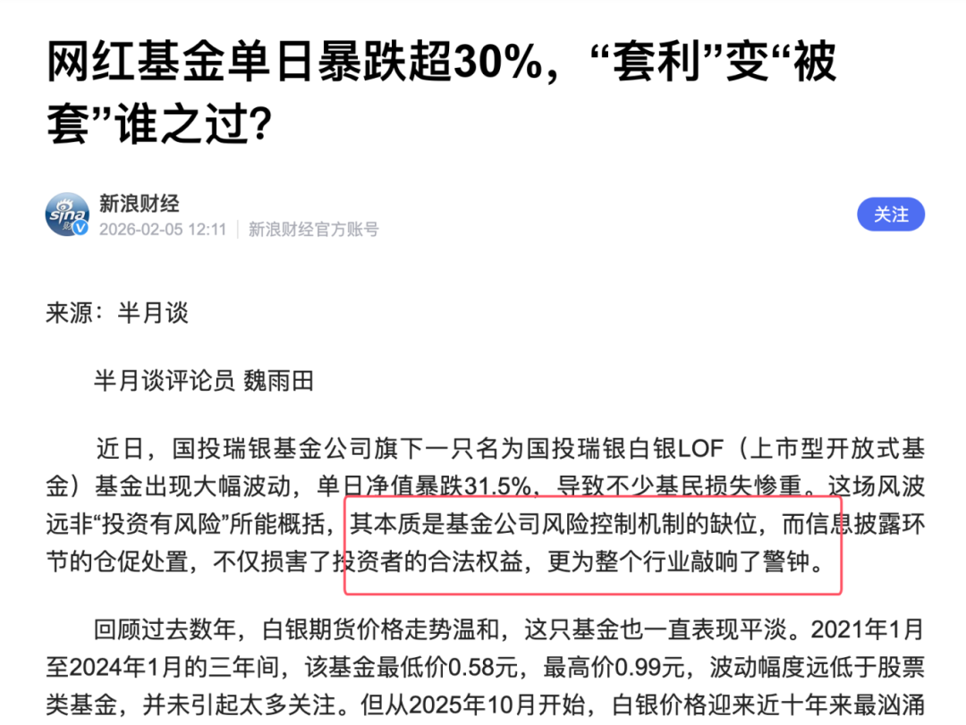 3、 其实看了一下,半月谈的作者早在 2025 年 12 月 31 日就警告过国投瑞银的白银 LOF 风险,国投瑞银把中华第一刊的警报当耳边风,才造成了现在恶劣情形。