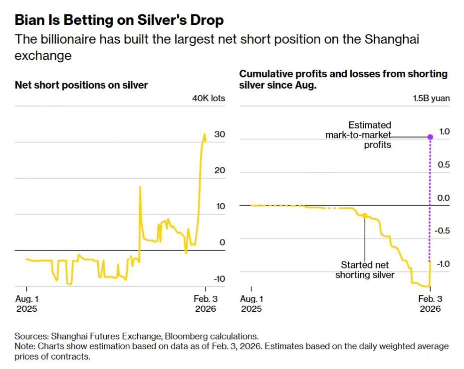边锡明的这笔押注,从2025年8月开始,前期曾建立白银多头仓位(根据交易所数据,此笔交易获利超过13亿元),2025年年末开始,突然且持续性地持有空头仓位,到现在2026年2月,净空头冲到了大概30万手(据知情人士表示,边锡明本人的押注以及他直接为少数几位客户管理的产品,占该公司贵金属持仓的大头。)对应右图他的累计盈亏,开始做空的一段时间里,都是浮亏的,基本上就是顶着浮亏在持续加仓,但是,随着最近白银价格的暴跌,到2月3号,账户浮盈预估10亿元,2月5号周四的大跌,可以确定这笔做空白银的盈利是进一步扩大了。