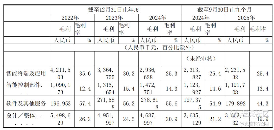 从细分业务来看,智能终端及应用业务毛利率从2022年的35.6%下降至2025年三季度的25.4%;智能控制部件毛利率则围绕13%上下波动;而软件及其他服务的毛利率也从2022年的57.4%大幅下降至2025年前三季度的44.3%。