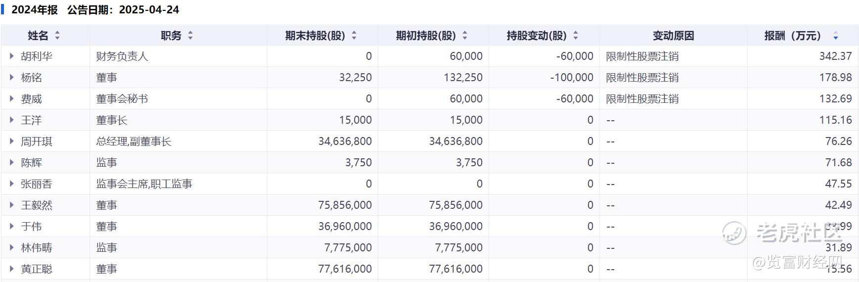 此外,董事长王洋同年薪酬为115.16万元,总经理周开琪的薪酬为76.26万元。