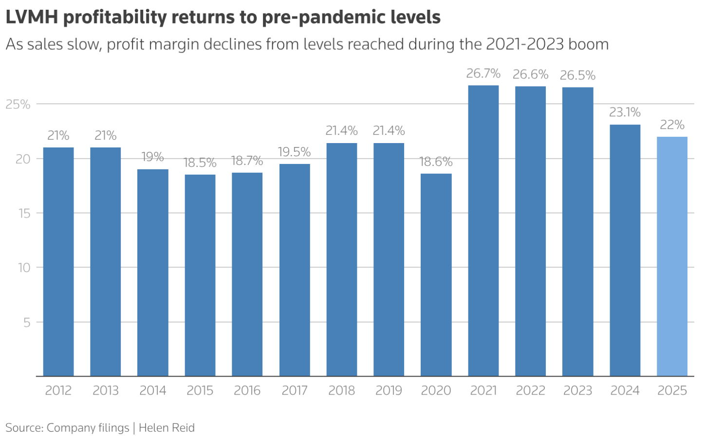 瑞银集团 的估算显示,中国消费者(包括出境游客)大约贡献了 LVMH 时装和皮具销售额的三分之一。不过,马乔也提醒说,大家都希望入门级消费者今年能明显回归,但眼下还看不到明确迹象,这个过程可能会比预期更慢一些。在美国关税、美元走弱以及整体需求放缓的多重影响下,LVMH 本年度的营业利润率已从 2024 年的 23.1% 降至 22%。首席财务官 塞西尔·卡巴尼斯 也坦言,想要让利润率重新回升,关键还是得靠销售增长。她表示,公司接下来会一边继续推动增长,一边严格管控成本。