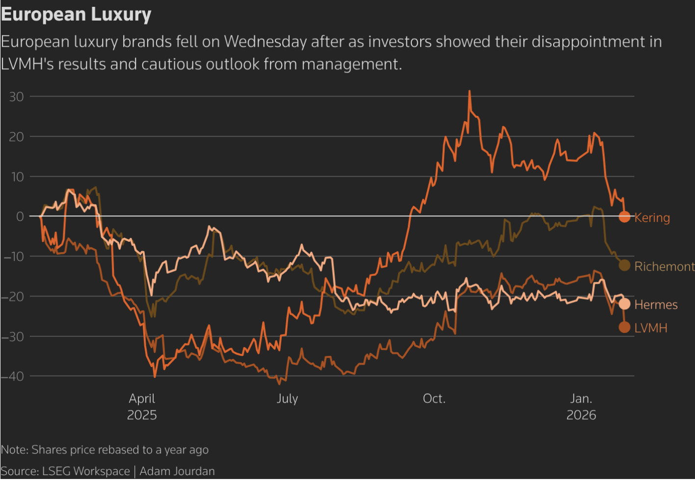 路威酩轩集团表示,本季度其在中国市场的销售实现增长。作为集团的核心市场之一,中国同时也是全球奢侈品行业的重要增长引擎。不过,鉴于此前 历峰集团 对中国前景给出了更为乐观的展望,投资者对 LVMH 的表现预期相应提高。尽管 LVMH 未单独披露中国市场的具体数据,但除日本以外的亚洲地区去年为其贡献了 26% 的收入。然而,按固定汇率计算,该地区第四季度销售额仅小幅增长 1%。