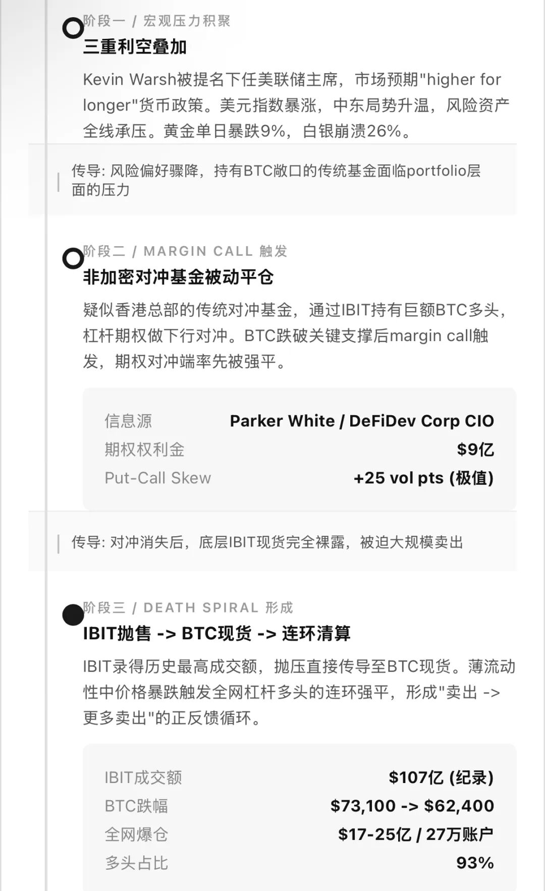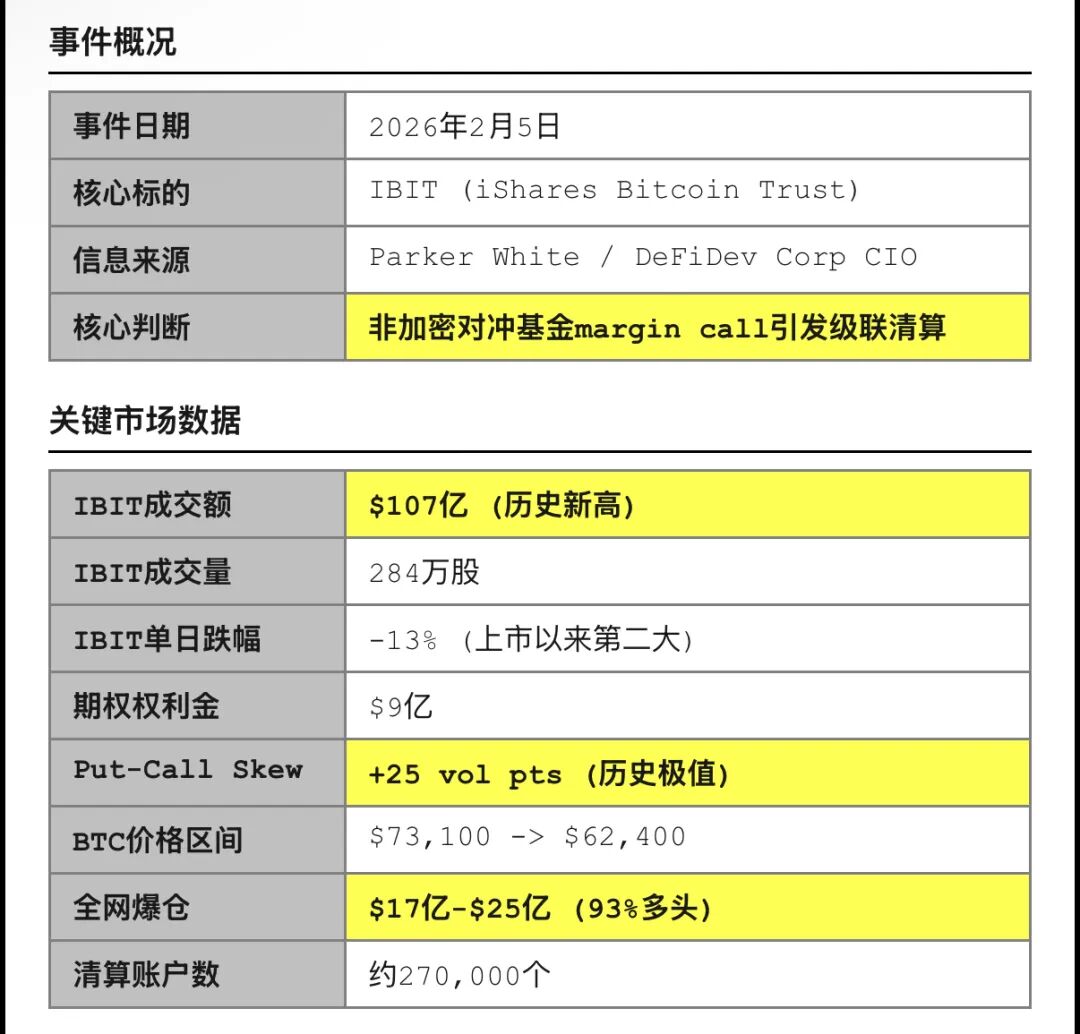 DeFiDev Corp首席投资官Parker White在Phemex News发表分析,将两者直接关联:这不是市场自然波动,而是一家持有大量IBIT的非加密对冲基金在margin call压力下的强制清算。