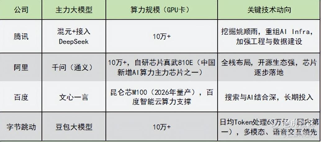 算力层面,四家巨头GPU保有量都较高,但供应链安全与成本控制是关键。百度昆仑芯M100即将量产,阿里有自研芯片真武810E(2026年1月22日,阿里决定支持旗下芯片公司平头哥未来独立上市);字节、腾讯大量采购H100等高端卡,但面临供应不稳定与价格波动风险。