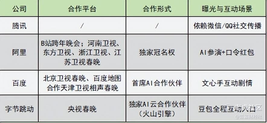 百度合作的北京卫视、天津卫视,区域性较强,覆盖范围偏华北;阿里千问此前拿下B站跨年晚会独家冠名权,现在又冠名河南卫视、东方卫视、浙江卫视、江苏卫视这四台卫视春晚,以年轻用户群体为主,与自身“场景闭环式”玩法契合;腾讯虽然在春晚合作上缺位,但微信、QQ加上元宝派等形成的社交裂变,能有效弥补春晚大屏流量的缺失。