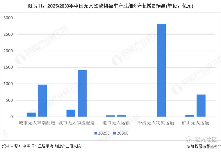 前瞻产业研究院表示,城市无人末端配送和城市无人物流配送发展空间前景广阔,预计至2030年产值增量分别为977亿元、1416亿元。总体而言,中国无人驾驶物流车产业总体产值增量达到5948亿元。