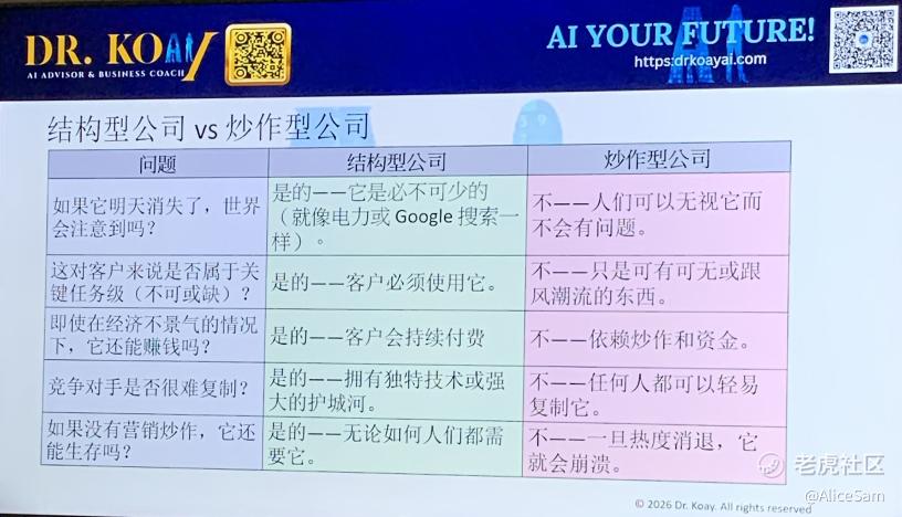 第二点,简单法则的持久价值。 无论是"不要亏损"的数学原理,还是区分结构型与炒作型公司的五问框架,这些简单的思维工具经过时间检验,比复杂的量化模型更具持久价值。AI应当服务于对这些基本原则的执行,而非替代它们。