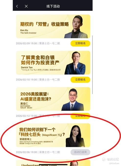 点击进去主页的 “我的线下活动”, 就可以看到一系列的主题讲座,每一个讲座的主讲人,讲的话题,都写的清清楚楚,例如我今天参加的这个 “我们如何识别下一个科技七巨头” ,主讲人是郭颖茵博士,这次的活动亮点就是带着大家一步一步的了解一套实用的五步股票筛选方法,并示范如何借助Tiger AI来整理资讯,减少市场噪音。