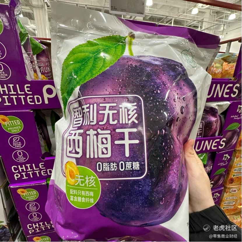 在这组产品中,溜溜梅智利无核西梅干的货架表现尤为稳定。它并不是作为“特色单品”被单独陈列,而是和上述果干产品一起,构成了山姆蜜饯果干区的基础结构。其产品信息同样聚焦于原果属性,配料构成简单,在这一阶段,仍能维持稳定销售表现,而非依赖短期促销拉动。这也是其能够长期出现在榜单前列,并被纳入常规补货范围的重要原因。