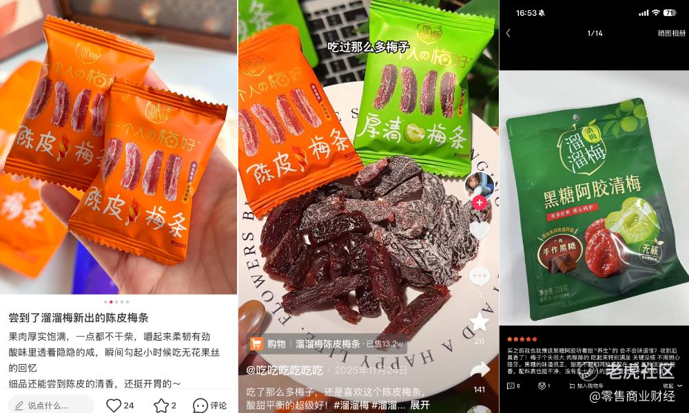 从榜单表现看,溜溜梅的陈皮梅条、黑糖阿胶清梅等新品并非集中出现在单一促销节点,而是在一段时间内保持可见度。