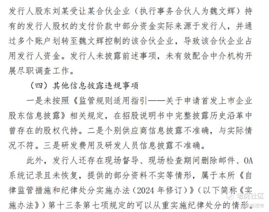 其四,存在其他多项信息披露违规:包括未按《监管规则适用指引——关于申请首发上市企业股东信息披露》要求完整披露历史沿革中的股权代持、个别供应商信息不准确、研发费用及研发人员信息披露不实等。