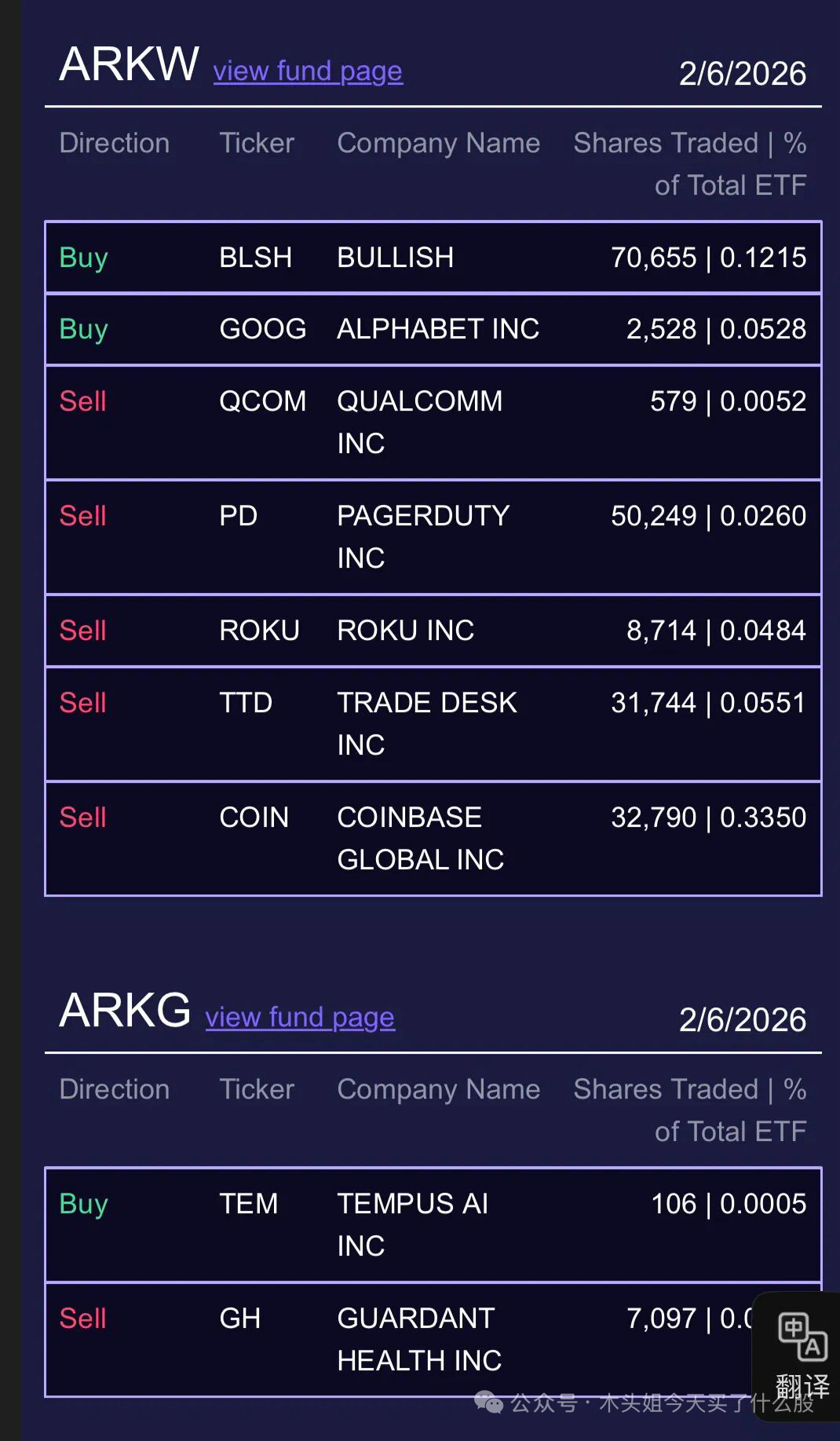 木头姐今天买入1000万美元BLSH、1000万美元谷歌、250万美元RXRX、23万美元THAR、3.5万美元TEM、1.8万美元KDK。