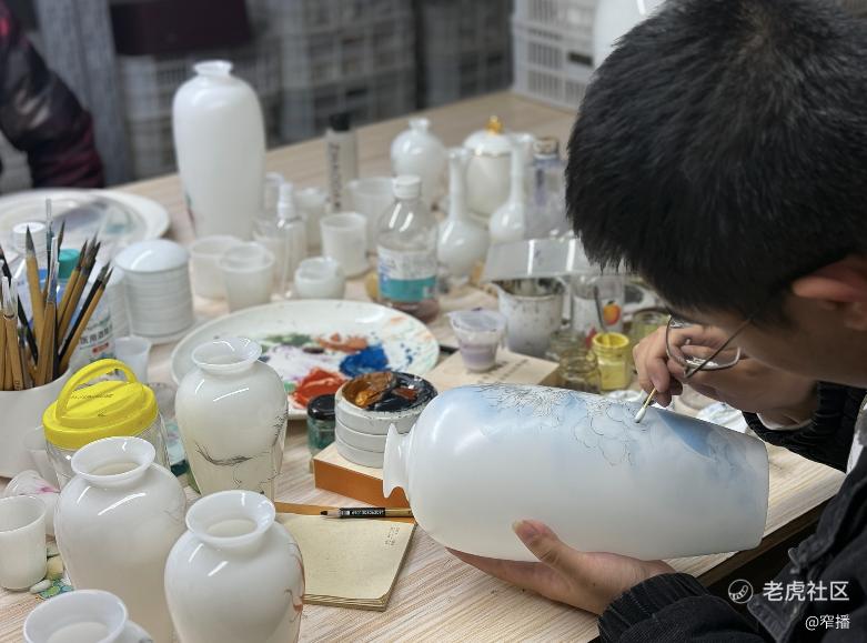 德化一位年轻的画师在工作间为白瓷花瓶画手绘龙纹