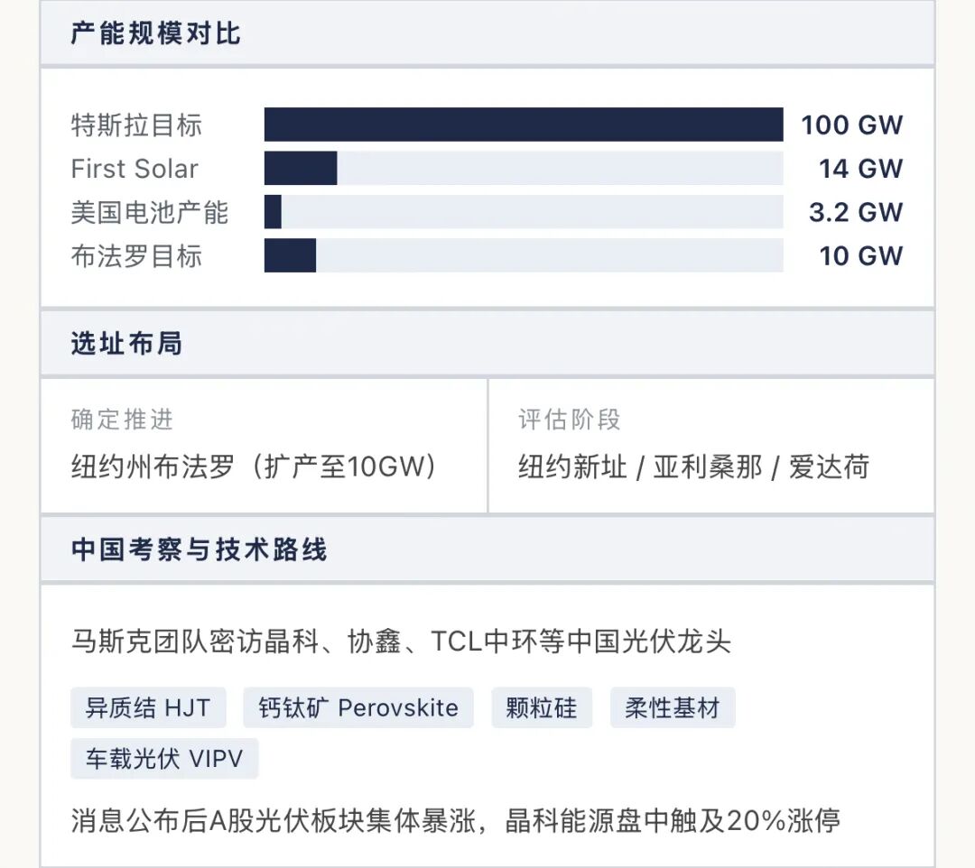 马斯克团队上周已密访晶科、协鑫等中国光伏企业,重点考察HJT异质结和钙钛矿技术。说白了,没有中国技术,这100GW就是空中楼阁。