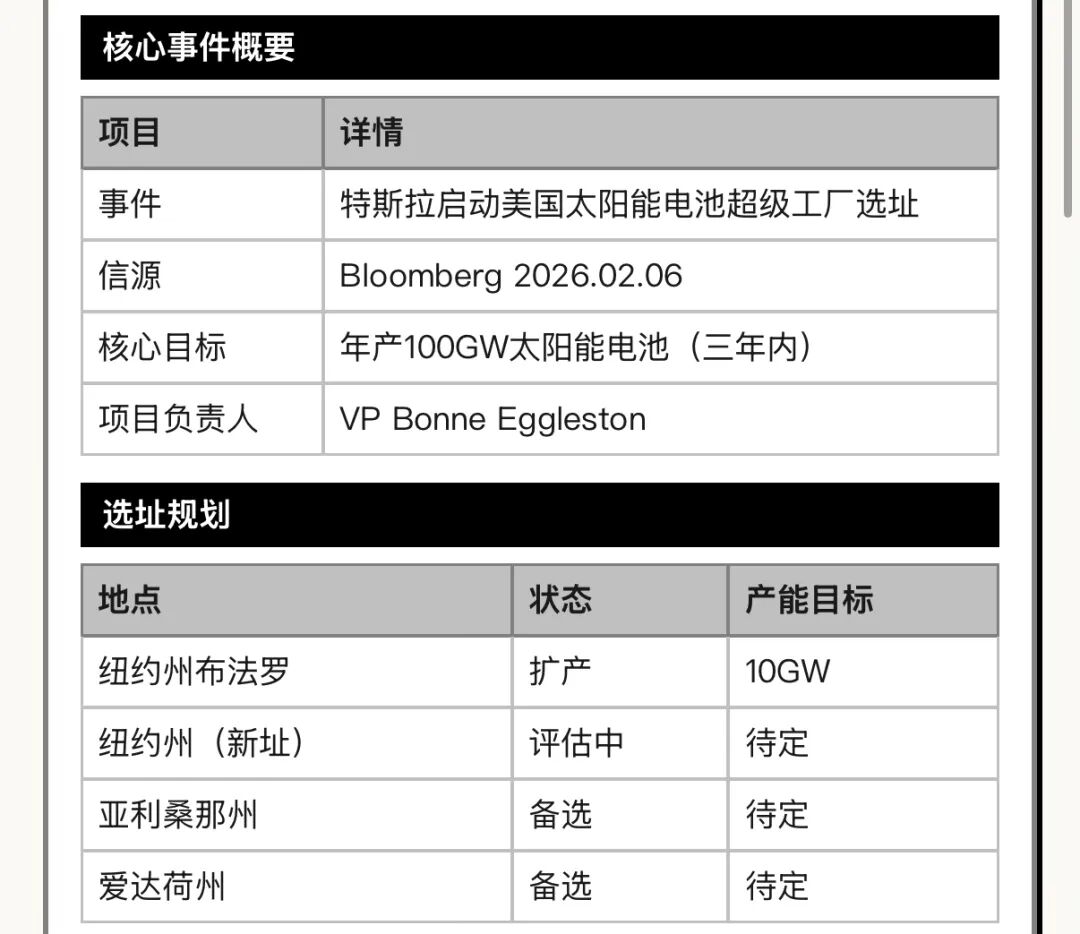 Bloomberg最新披露,特斯拉正在美国多州评估太阳能电池制造选址,马斯克在达沃斯提出的"年产100GW太阳能"目标,正从概念迅速进入工业落地阶段。