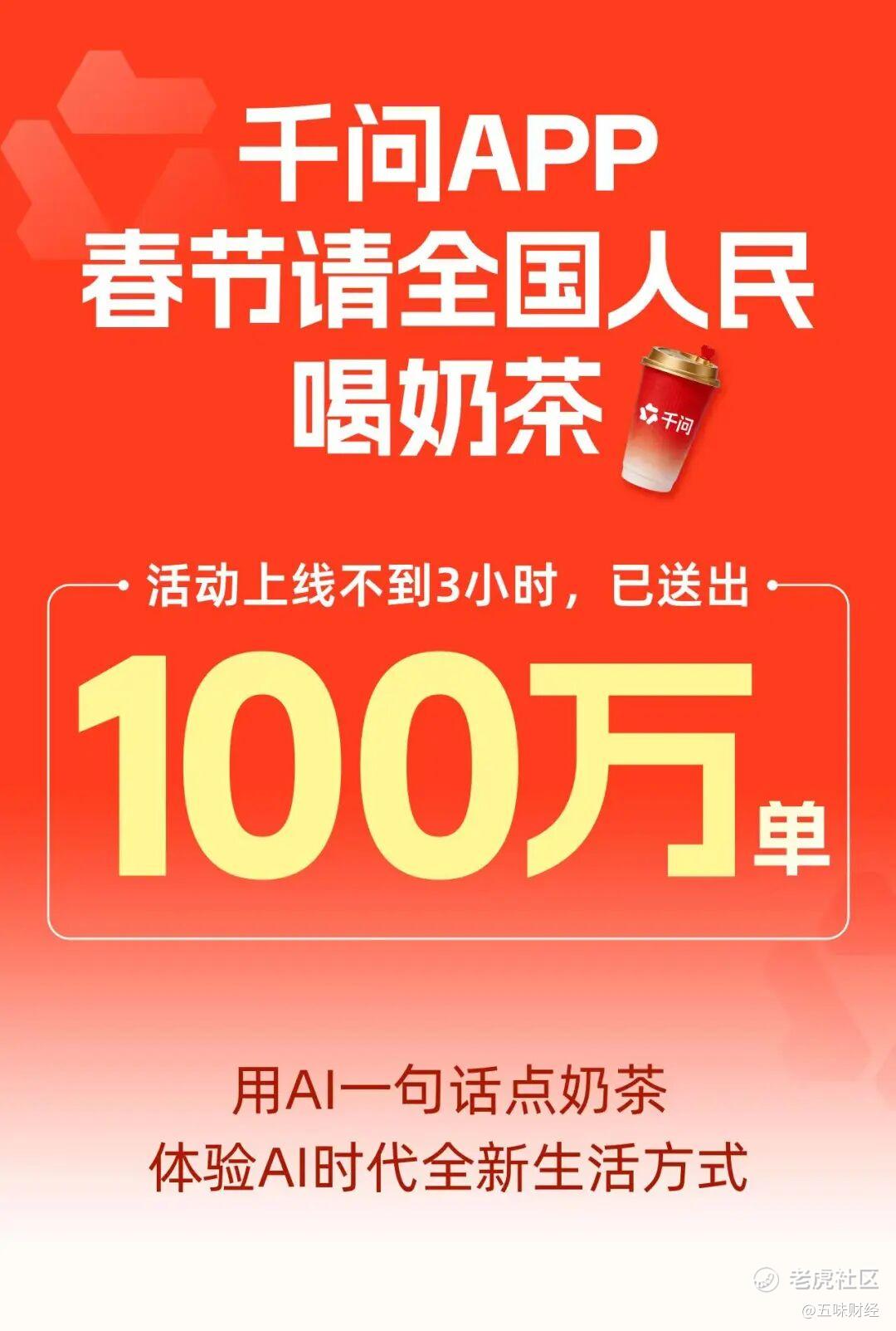 2月1日,腾讯高调宣布投入10亿资源用于春节红包活动;2月6日,阿里千问APP“春节30亿大免单”接力上线,发起奶茶攻势,请全国人民“用AI一句话免费点奶茶”。