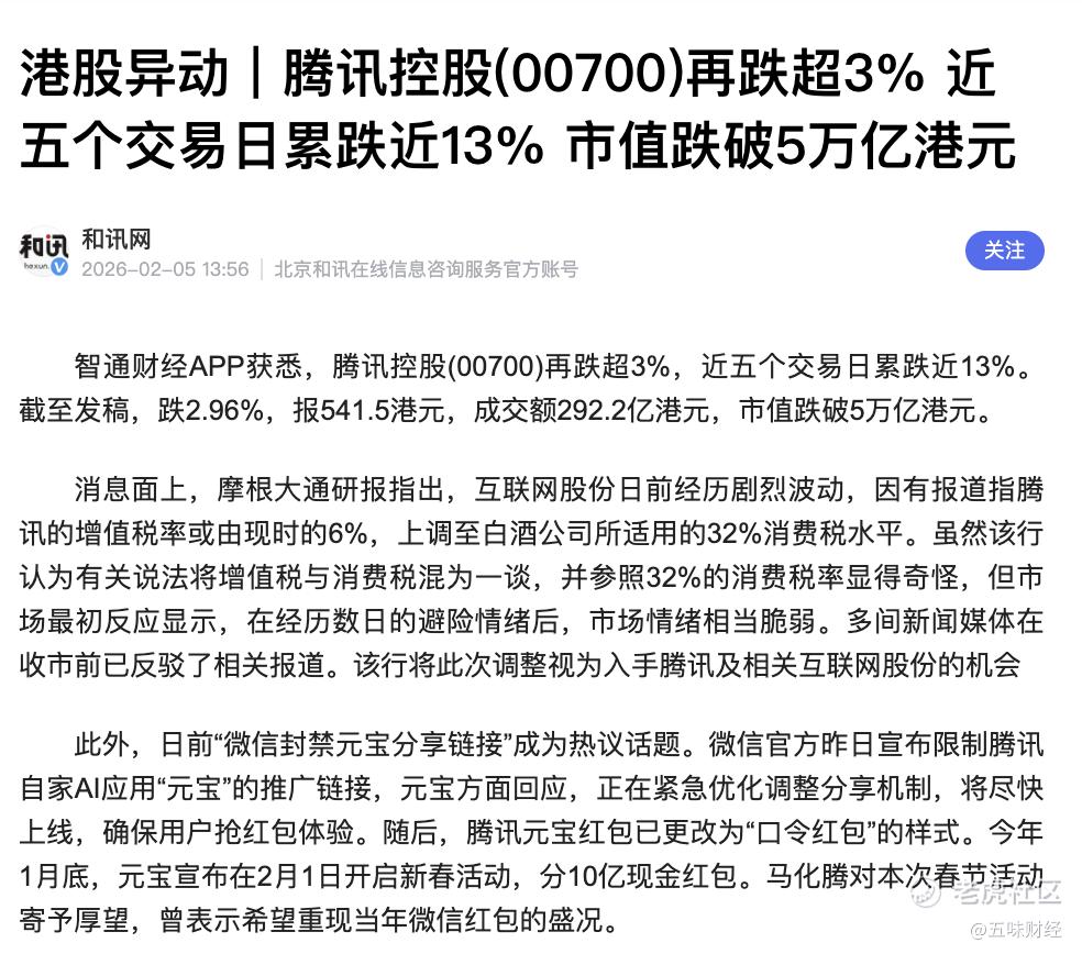 2月6日,腾讯连续第6日下跌,市值失守5万亿港元,回吐了近四年的涨幅;阿里市值亦在震荡中蒸发千亿。