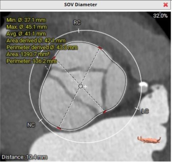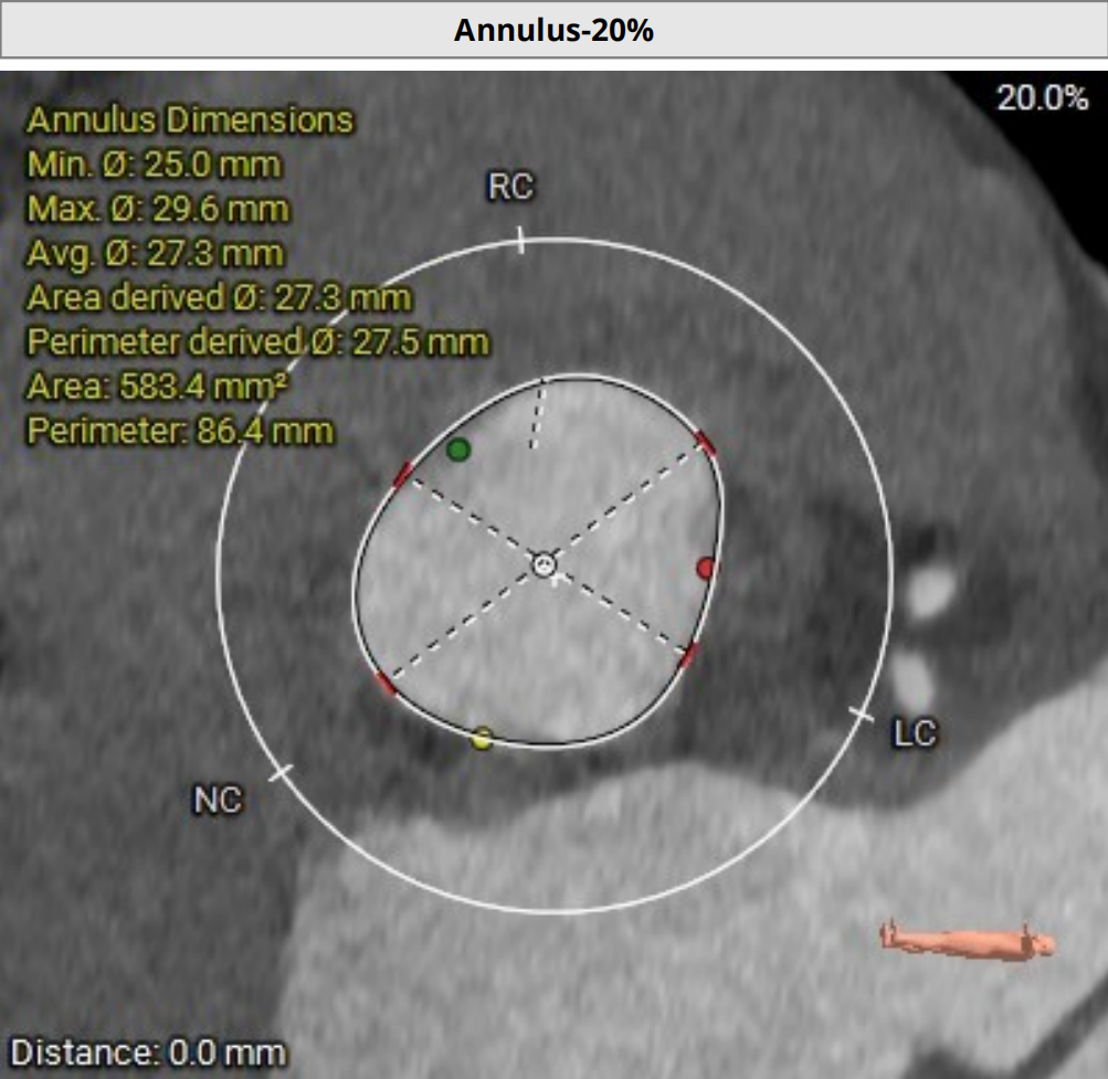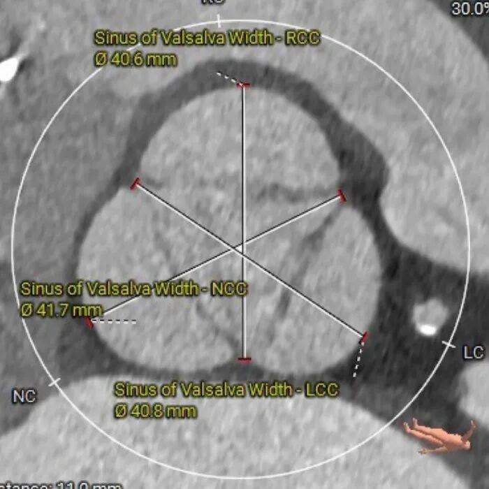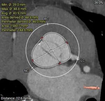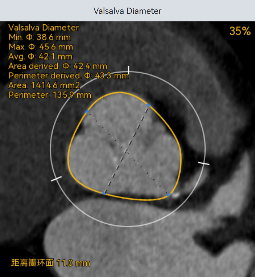 三叶式主动脉瓣,瓣叶增厚,升主动脉内径增大,瓣环夹角64°,瓣环周长85.4mm,选用L号TaurusTrio瓣膜。